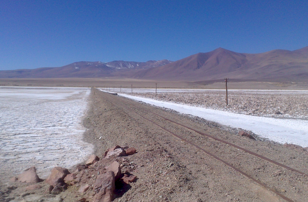 Continuamos viajando; en ese tramo el camino va sobre el salar y es bastante fácil tener alguna rotura con las filosas rocas sueltas o en algún descuido, con alguna salida de pista. Es necesario tomarlo con la debida precaución para no arruinar las vacaciones. Más adelante paramos en el cruce del camino con las vías del Tren a las Nubes para hacer fotos; el malestar parecía haber aflojado un poco. Armamos el trípode para hacer unas cuantas fotos a la vez que nos íbamos aclimatando a la dura Puna.