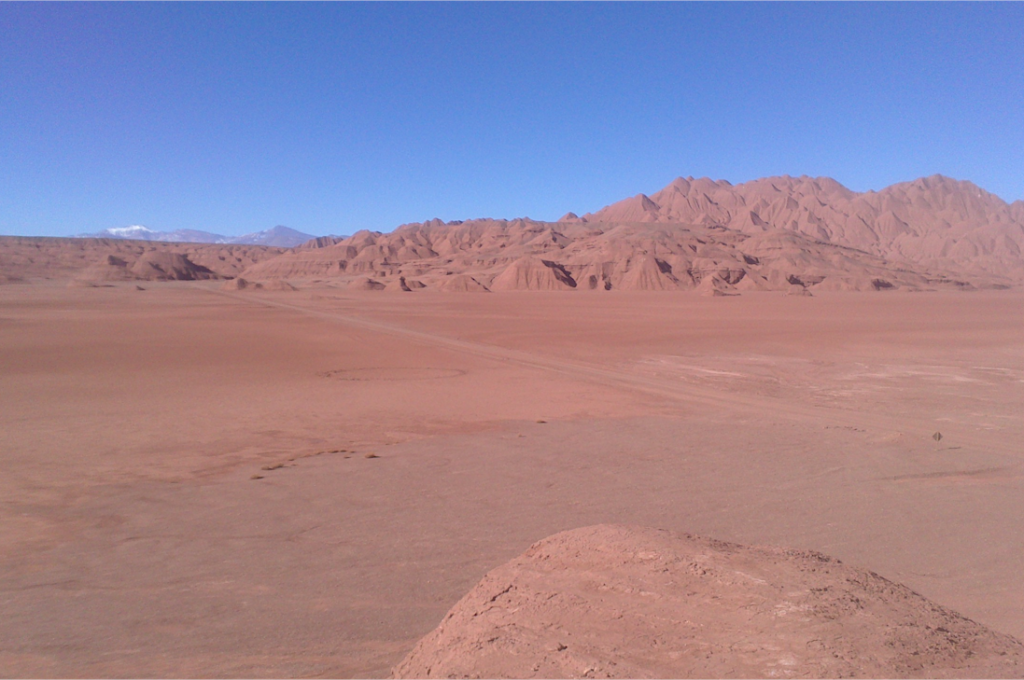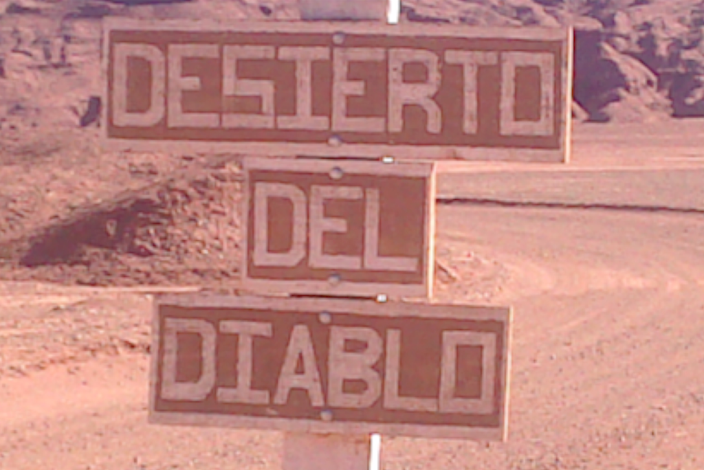 Continuamos viaje; una larga recta de unos 13 o 14 kilómetros, nos alejó del salar para colocarnos en una zona sinuosa y muy pintoresca, totalmente de tierra de un color marrón tirando al rojo. Más adelante pasamos el paraje Siete Curvas y luego llegamos al mítico Desierto del Diablo, donde volvimos a parar para fotografiar el increíble paisaje.
